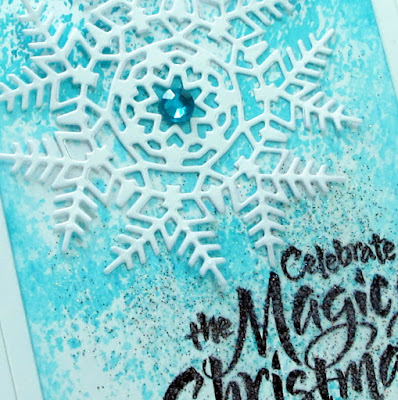I die-cut the snowflake, glued it in place and added a blue gem to the center.