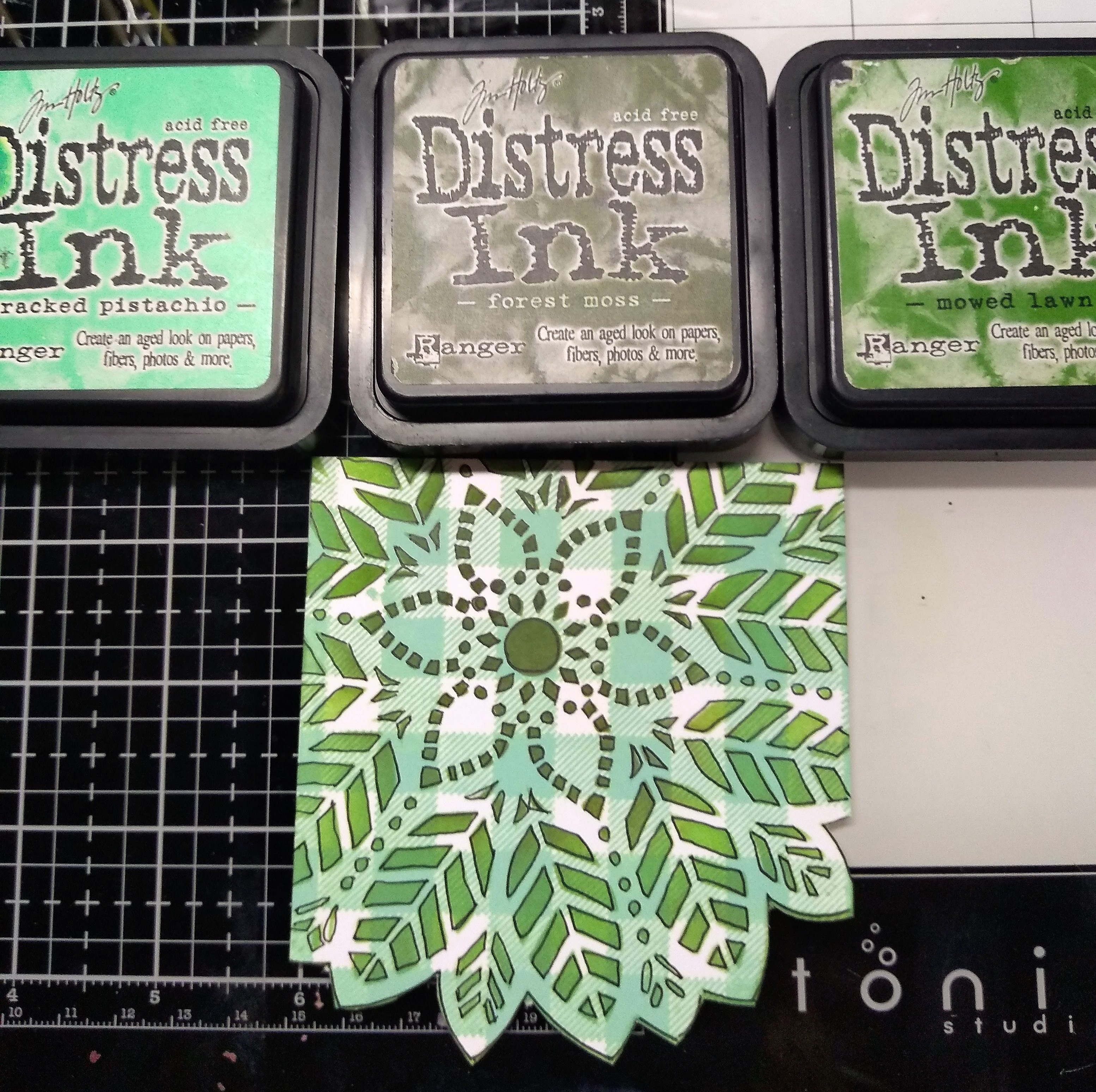 • Using some Forest Moss Distress ink, I started blending into the center area of the doily.  I blended some Mowed Lawn DI more into the outside edges.